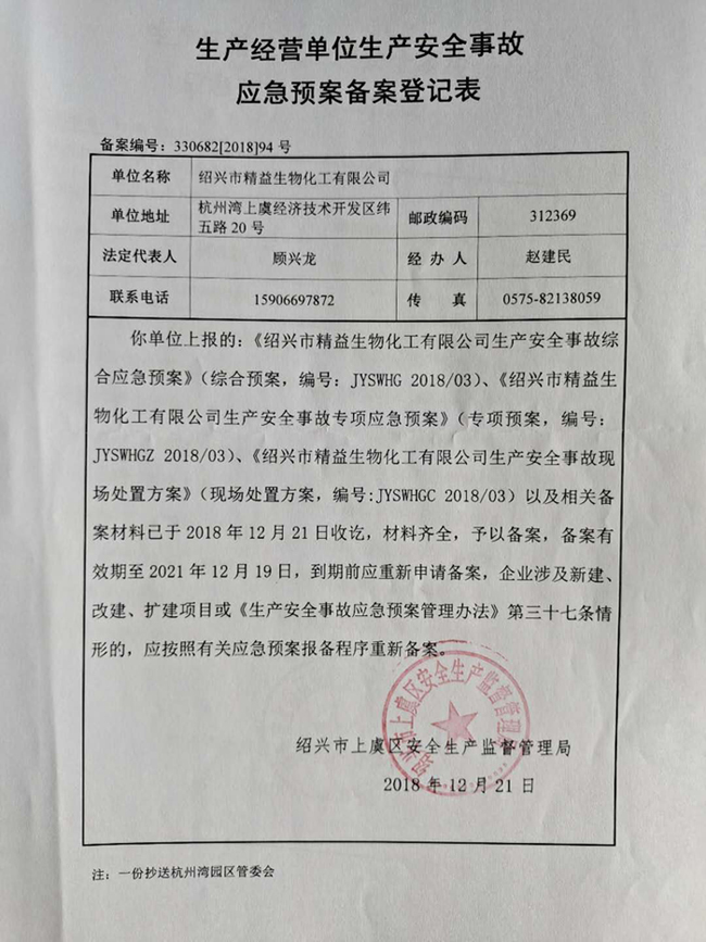 紹興市精益生物化工有限公司生產(chǎn)經(jīng)營(yíng)單位生產(chǎn)安全事故應(yīng)急預(yù)案?jìng)浒驳怯洷?/h1>